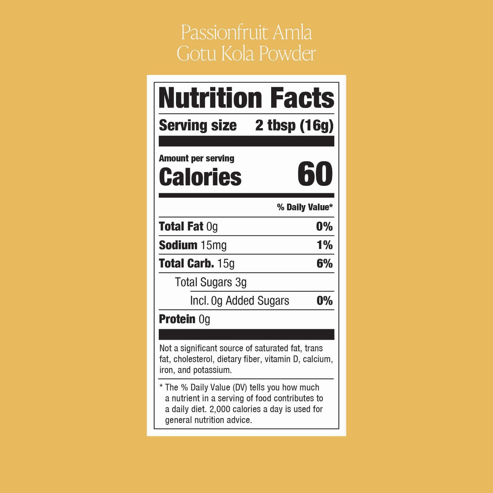 Passionfruit extract powder, gotu kola extract powder, gooseberry extract powder, tapioca syrup, maltodextrin (tapioca-based). Nutrition Facts: Serv. size: 2 tbsp (16g), Amount per serving: Calories 60, Total Fat 0g (0% DV), Sodium 15mg (1% DV), Total Carb. 15g (6% DV), Total Sugars 3g (Includes 0g Added Sugars, 0% DV), Protein 0g. Not a significant source of sat. fat, trans fat, cholest., fiber, vit. D, calcium, iron, and potas. *% DV = % Daily Value.